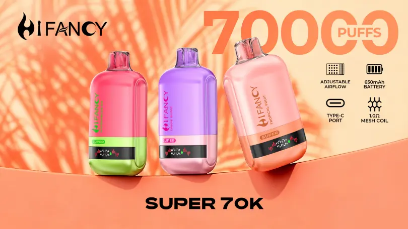 - Smart Screen: Hifancy Super 70000 70K Puffs keeps you fully informed with a smart screen that provides real-time updates on battery life and e-liquid level.