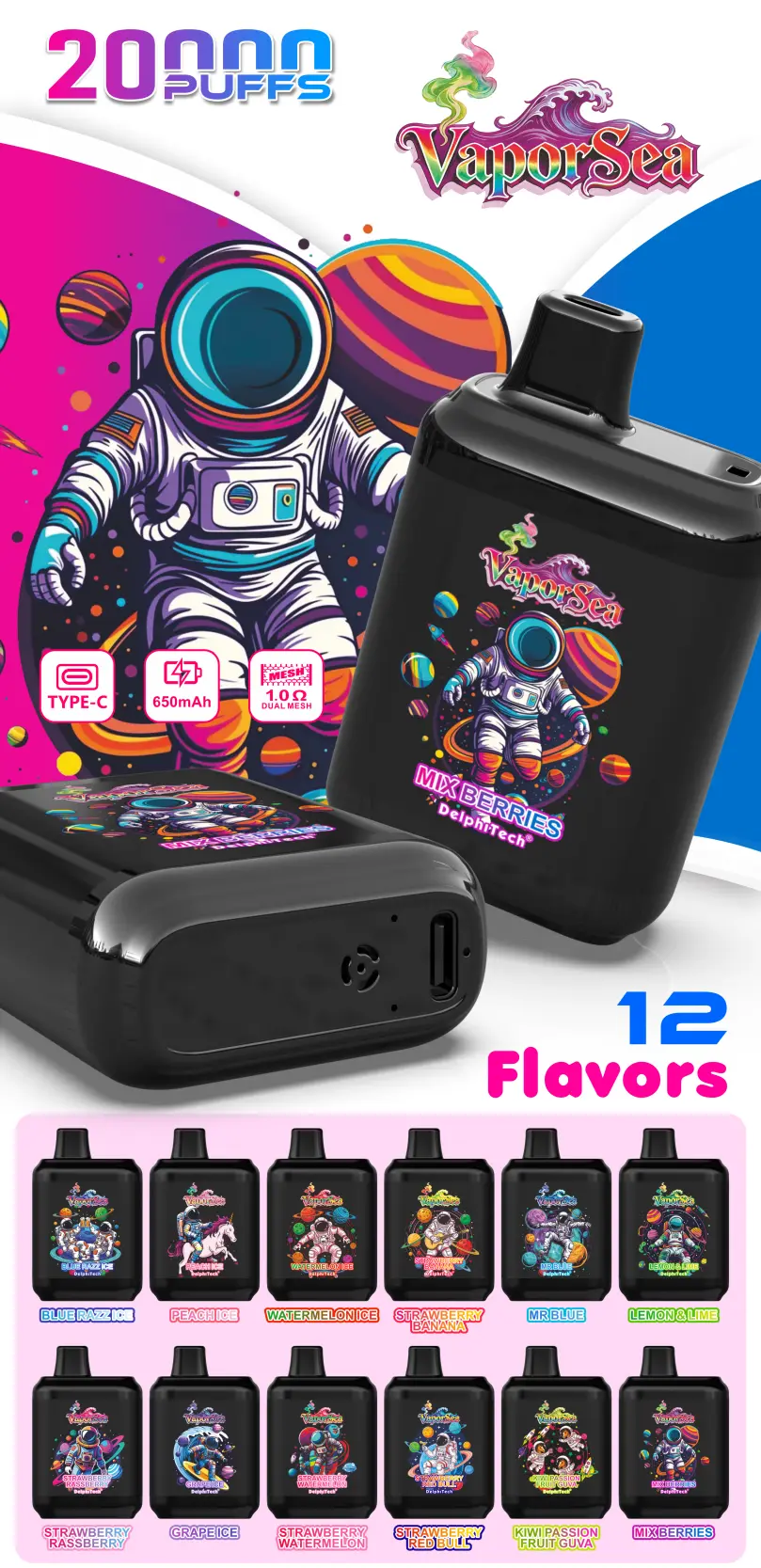 - Recharge Battery: The Vaporsea 20K 20000 Puffs is made to last, backed by a long-lasting battery and fast Type-C charging.